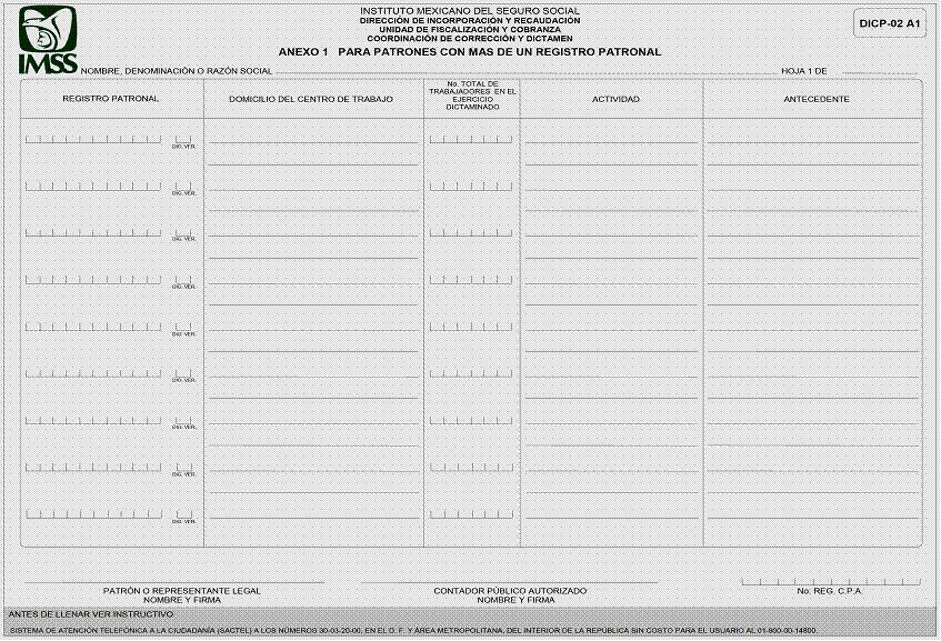 4. Para los patrones que cuenten con más de un registro patronal, presentará además del aviso de dictamen, el Anexo 1 (formato DICP-02 A1), en tantas hojas como sea necesario; en la columna correspondiente al domicilio del centro de trabajo, anotará el domicilio de cada registro patronal; en la columna No. de trabajadores, se anotará el total que resulte de sumar los que prestaron sus servicios en cada uno de los meses por centro de trabajo; la actividad desarrollada en cada centro de trabajo y en la columna de antecedente, deberá indicar el que corresponda: orden de visita, invitación/requerimiento o solicitud patronal por corrección, así como el número de folio y la fecha de emisión.