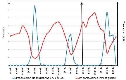 94. En este sentido, la Secretaría confirmó lo señalado por la UNIFRUT sobre la estacionalidad de la producción de manzanas y el comportamiento cíclico que mantienen las importaciones investigadas al observar que en meses previos a los de cosecha, se presentan los volúmenes máximos de las mismas, como se observa en la Gráfica 3, lo que apoya el argumento de que los productores de los Estados Unidos se deshacen de sus excedentes de manzanas del cultivo del año anterior e impiden a los productores nacionales colocar sus manzanas en el mercado mexicano, inclusive en los refrigeradores existentes a nivel nacional.