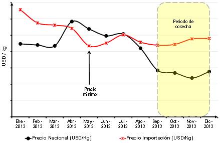 108. En cuanto a los precios nacionales reportados por el SNIIM, se observó que el precio promedio de la mercancía similar producida por la rama de la producción nacional medido en dólares registró incrementos de 7% en 2012 y 16% en el periodo investigado, acumulando un crecimiento de 25% en el periodo analizado. Cabe señalar que al comparar dicho precio con el precio de las importaciones investigadas en términos anuales, no se observaron niveles de subvaloración. Sin embargo, al analizar las cifras mensuales de ambos precios, se confirmó lo señalado por la UNIFRUT respecto a la existencia de subvaloración (entre 0.5% y 9%) en los meses previos a la cosecha nacional del periodo investigado, tal como se observa en la Gráfica 4.