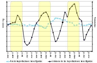 Gráfica 5. Precios y volúmenes de la mercancía investigadas en 2013