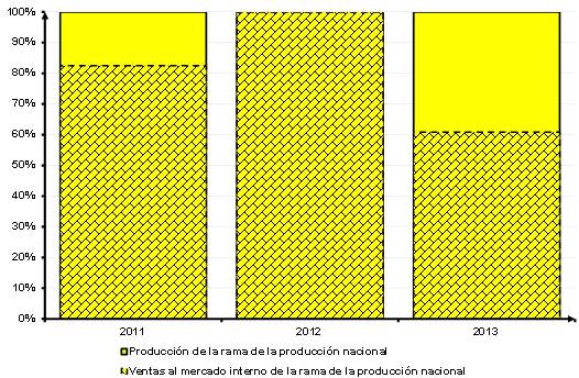 b. Las importaciones investigadas registraron una tendencia creciente tanto en términos absolutos (45% de 2011 a 2013) como en relación con el mercado (de 22% en 2011 a 24% en 2013) y las ventas al mercado interno de la rama de la producción nacional (de 30% en 2011 a 31% en 2013) a lo largo del periodo analizado. Ello se tradujo en desplazamiento de las ventas internas de la rama de la producción nacional y una mayor participación de las importaciones objeto de investigación en el mercado mexicano.