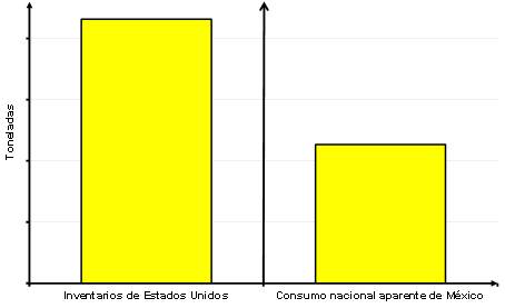 e. la industria de los Estados Unidos productora de manzana cuenta con niveles de producción, capacidad instalada e inventarios que representan varias veces la producción y la capacidad instalada de la rama de la producción nacional de manzana, así como la producción nacional y el mercado mexicano de manzana. En este sentido, se observó que en el periodo investigado: i) la producción y la capacidad instalada de la rama de la producción nacional representaron el 14% y 11% de la producción y la capacidad instalada de los Estados Unidos, respectivamente; asimismo, sólo el nivel de inventarios que tuvo la industria de los Estados Unidos en 2013 representó 2.3 y 1.7 veces el tamaño de la producción nacional y el mercado mexicano, respectivamente, tal como se observa en la Gráfica 7, y