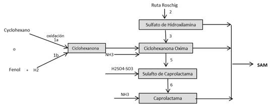 11. El sulfato de amonio también se puede obtener como coproducto en la elaboración de la caprolactama (al producirse un kilogramo de caprolactama se obtienen entre 4 y 4.5 kilogramos de sulfato de amonio), materia prima básica para la fabricación de nailon. En dicho proceso, las principales materias primas que se utilizan para su fabricación son además del amoniaco y el azufre, el ciclohexano y el bióxido de carbono, tal como se observa en el Diagrama 1.