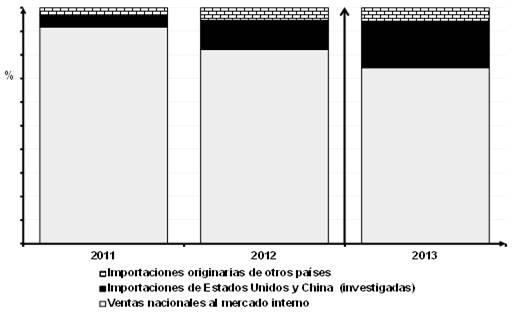 150. Con base en dicha información, la Secretaría confirmó una disminución del precio de las importaciones investigadas durante todo el periodo analizado: 15% de 2011 a 2013. Su precio promedio disminuyó 8% en 2012 y 8% en el periodo investigado. Asimismo, el precio promedio de las importaciones originarias de países distintos a los investigados aumentó 6% en 2012 y 11% en el periodo investigado (de manera acumulada registró un aumento de 17% al comparar 2011 con 2013). Al respecto, la Secretaría observó que el precio de dichas importaciones fue superior al precio de las importaciones investigadas en 2012 y 2013.