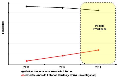 157. Con base en los resultados descritos en los puntos 149 a 156 de la presente Resolución, la Secretaría determinó preliminarmente la existencia de subvaloración del precio promedio de la mercancía investigada respecto al precio promedio de las ventas internas de la rama de producción nacional, la cual influyó en el comportamiento de los precios nacionales observado en el periodo investigado. Este nivel de precios propició un elevado crecimiento del volumen de las importaciones originarias de los Estados Unidos y de China durante el periodo investigado, tanto en términos absolutos como en relación con el mercado y la producción nacional.