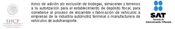 10. Aviso de adición y/o exclusión de bodegas, almacenes y terrenos a la autorización para el establecimiento de depósito fiscal, para someterse al proceso de ensamble y fabricación de vehículos a empresas de la industria automotriz terminal o manufacturera de vehículos de autotransporte.
