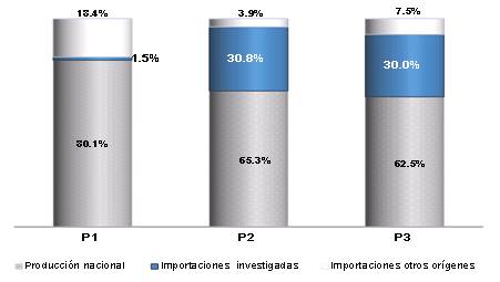 470. Las importaciones investigadas pasaron de una contribución de 7% en las importaciones totales en el periodo abril de 2011-marzo de 2012 a 80% en el periodo investigado; en los mismos periodos, su participación en el mercado nacional pasó de 1.5% a 30%, lo que significó un aumento de 28.5 puntos porcentuales.