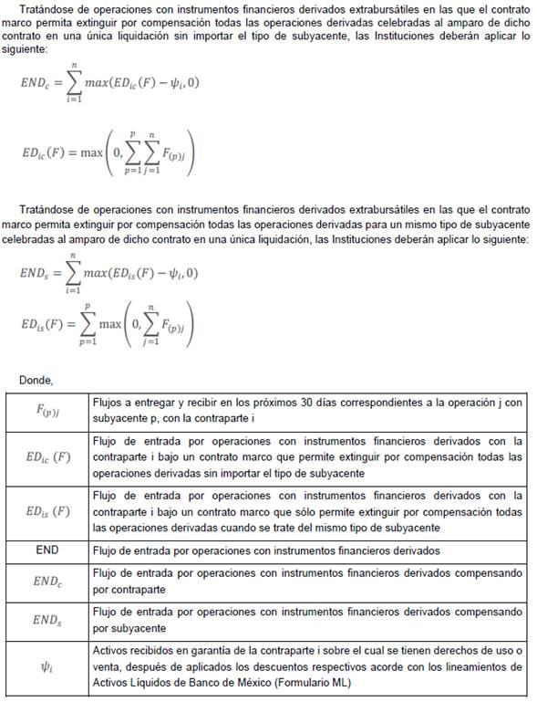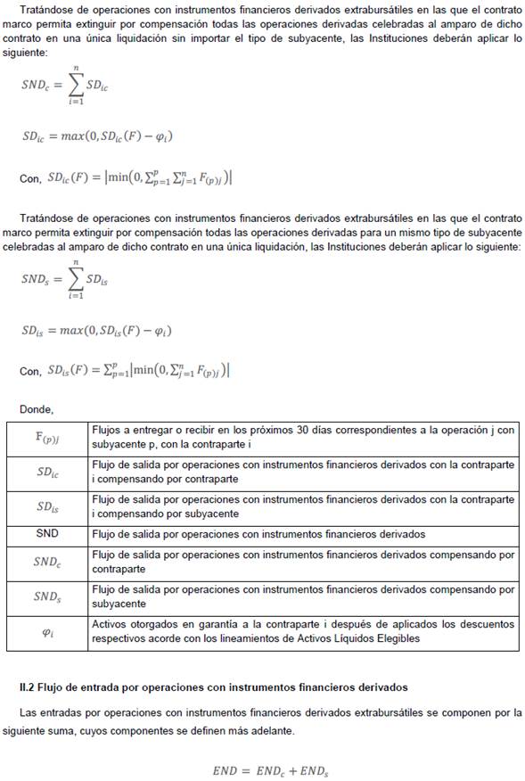 Los flujos de entrada y salida (F) a los que hace referencia esta sección se definen como los flujos contractuales de entrada y salida que se tenga programado recibir o entregar, respectivamente, durante los próximos 30 días para instrumentos financieros derivados extrabursátiles. Dichos flujos se deben calcular de acuerdo a las metodologías de valuación utilizadas en cada Institución al día de la fecha del cálculo del Coeficiente de Cobertura de Liquidez.