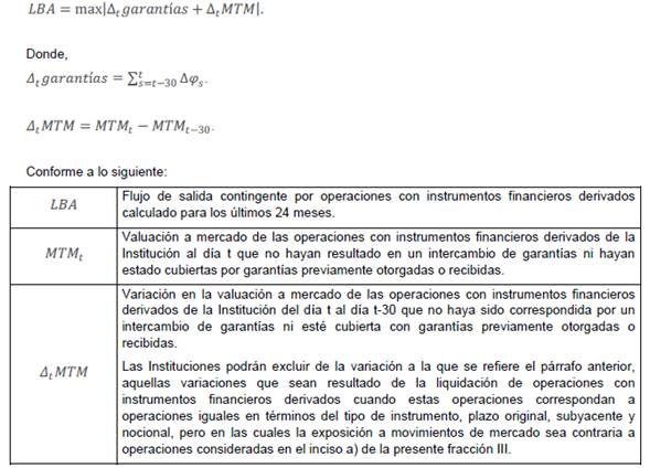 Las Instituciones deberán calcular el flujo de salida contingente por operaciones con instrumentos financieros derivados como el máximo valor absoluto de la suma de los montos referidos en los incisos a) y b) siguientes, calculando dichos incisos para cada horizonte de treinta días consecutivos durante los últimos 24 meses (Look Back Approach). Para cada horizonte de 30 días consecutivos, se deberán sumar: