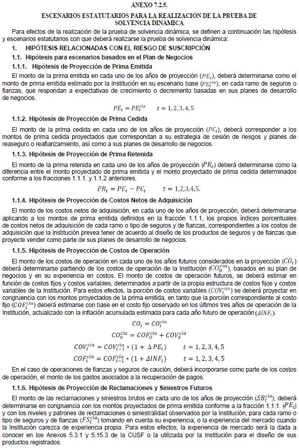 Que de acuerdo con la Disposición 7.2.5. de la Circular Única de Seguros y Fianzas, las instituciones de seguros y de fianzas deben considerar para la realización de la Prueba de Solvencia Dinámica, los escenarios estatutarios previstos en el Anexo 7.2.5. de la citada Circular.