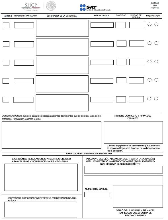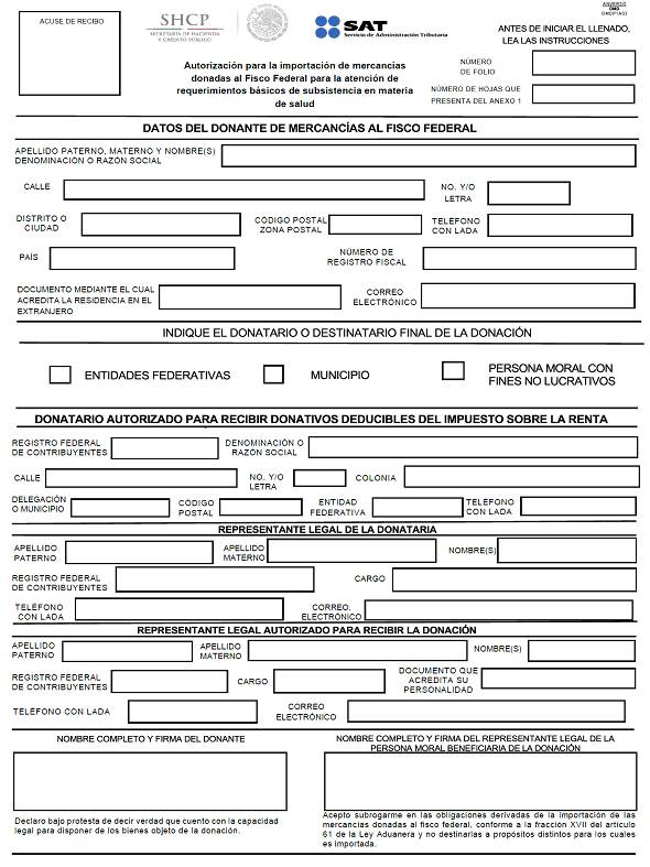 3. El Anexo 1, de la “Autorización para la importación de mercancías donadas al Fisco Federal para la atención de requerimientos básicos de subsistencia en materia de salud”, con el total de las mercancías que se pretenden importar de manera paulatina. 4. Carta de aceptación de la donación dirigida a la ACNCEA, en hoja membretada del donatario, signada por el representante legal de la donataria, en la que se deberá: a) Manifestar la aceptación expresa de las mercancías objeto de la donación, especificando la cantidad, los elementos que ilustren y describan de manera detallada las características físicas y técnicas, en forma cuantitativa y cualitativa de las mercancías, el uso, distribución y destino final que se dará a las mismas. b) Cuando la mercancía vaya a ser transferida a un destinatario distinto de la donataria, se deberá manifestar dicha situación, especificando los datos de la institución receptora y adjuntando la carta de aceptación signada por dicho destinatario, con los datos a que se refieren los incisos a) y c) del presente numeral. Cuando el destinatario distinto de la donataria, a que se refiere el párrafo anterior, sea persona moral con fines no lucrativos deberá contar con la autorización para recibir donativos deducibles en los términos de la Ley del ISR. c) Presentar el plan de distribución de los insumos para la salud que garantice su administración en los pacientes o uso dentro de la fecha de caducidad, incluyendo el procedimiento de destrucción de los mismos. Para aquellos medicamentos que requieran de red o cadena fría para su distribución deberán contar además con los registros de su conservación durante el transporte y distribución hasta su entrega al consumidor. 5. Tratándose de medicamentos; presentar el certificado de calidad, la licencia sanitaria o aviso de funcionamiento del hospital o clínica al que va a ser dirigida la mercancía de acuerdo al servicio que proporciona, el aviso de responsabilidad sanitaria y copia de la cedula profesional del médico responsable de cada establecimiento, así como manifestar: a) Fecha de caducidad, ingrediente activo, gramaje por unidad, tipo de medicamento, forma de presentación farmacéutica. b) Unidad de medida de tarifa, cantidad de unidad de medida de tarifa, unidad de medida comercial, cantidad de unidad de medida comercial, país de origen, país de procedencia. c) Nombre del fabricante. d) Que se encuentran en buen estado para su uso. 6. Tratándose de equipo e insumos médicos; presentar los catálogos, manuales de funcionamiento, información técnica y fotografías correspondientes, así como manifestar: a) Unidad de medida de tarifa, cantidad de unidad de medida de tarifa, unidad de medida comercial, cantidad de unidad de medida comercial, país de origen, país de procedencia. b) Nombre del fabricante. c) Certificado de calidad. d) Que se encuentran en buen estado para su uso. |