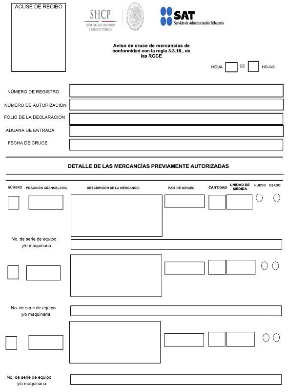 Información adicional: 1. En caso de que la autoridad observe la omisión de alguno de los datos, información o documentación señalados en la regla 3.3.16., en el formato oficial, en el instructivo de trámite correspondiente, o si derivado de la naturaleza del trámite la autoridad necesite cualquier otra documentación que permita la plena identificación de las mercancías (fotografías, etiquetas, manuales, catálogos informativos, etc.) se requerirá al destinatario de la donación en términos del penúltimo párrafo del artículo 18 del CFF. 2. En caso de no subsanarse la omisión motivo del requerimiento, la solicitud se tendrá por no presentada. 3. Si se observa que se omitió alguno de los datos, información o documentación señaladas en el formato oficial e Instructivo de trámite, la solicitud se tendrá por no presentada. Asimismo, si se detectan causas para no aceptar la donación, la ACNCEA comunicará el rechazo de la misma. |