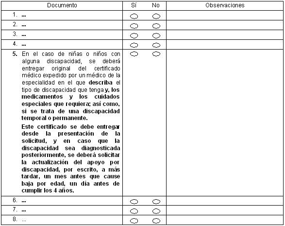 2a. ... 2b. ... 2c. ... 2d. En el caso de las niñas o niños con alguna discapacidad, se deberá entregar original del certificado médico expedido por un médico de la especialidad, en el que se describa el tipo de discapacidad que tenga, los medicamentos y los cuidados especiales que requiera; así como, si se trata de una discapacidad temporal o permanente. Este certificado se debe entregar desde la presentación de la solicitud, y en caso que la discapacidad sea diagnosticada posteriormente, se deberá solicitar la actualización del apoyo por discapacidad, por escrito, a más tardar, un mes antes que cause baja por edad, un día antes de cumplir los 4 años. |