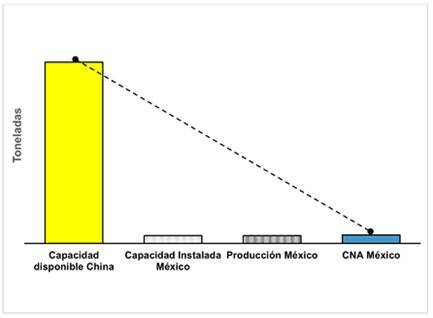 c. la capacidad libremente disponible de China (capacidad instalada menos producción) aumentó 14% de 2013 a 2017, al pasar de 1,031 a 1,173 mil de toneladas, este último volumen es equivalente a más de 22 veces la producción nacional de México y más de 21 veces el CNA del periodo de examen;