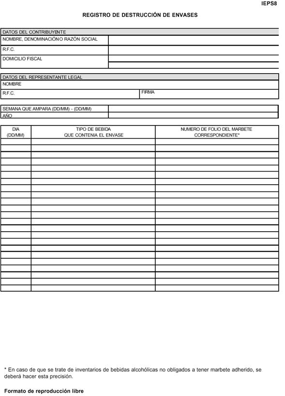 Registro de destrucción de envases. 21.6 x 27.9 cms./Carta. Impresión negra en fondo blanco. Esta forma es de libre impresión.