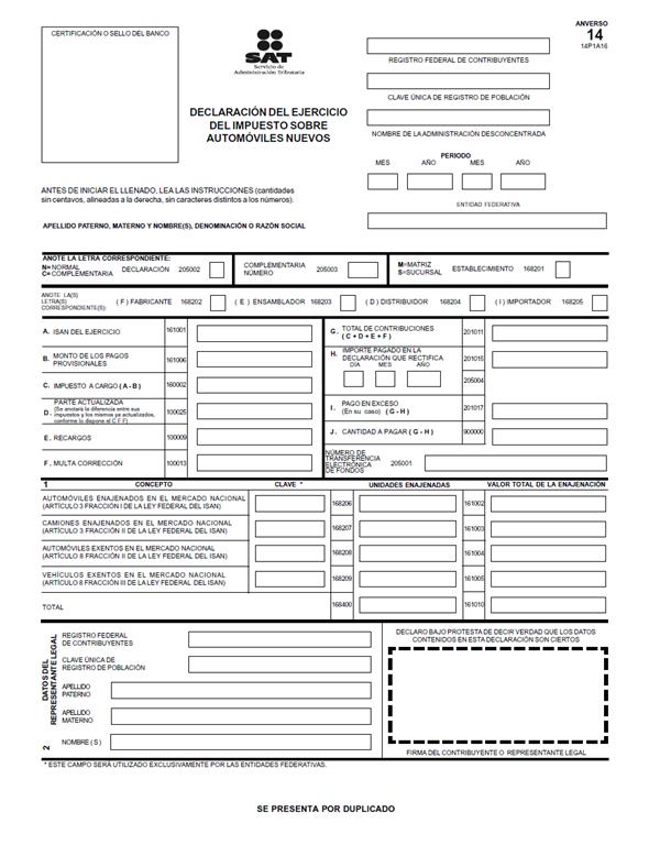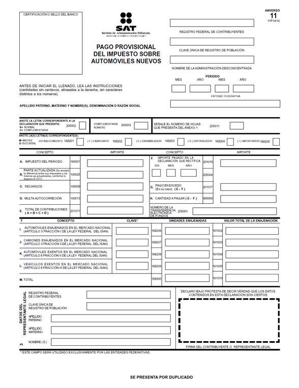 Pago provisional del impuesto sobre automóviles nuevos. 21.6 x 27.9 cms./Carta. Impresión negra en fondo blanco. Esta forma es de libre impresión.