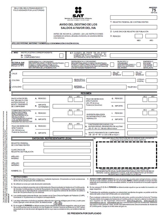 Aviso del destino de los saldos a favor del IVA. 21.6 x 27.9 cms./Carta. Impresión negra en fondo blanco. Esta forma es de libre impresión.