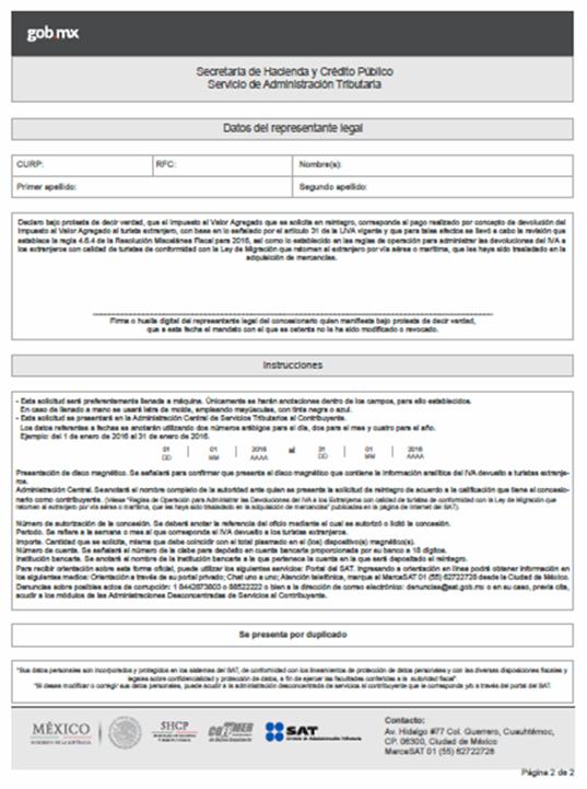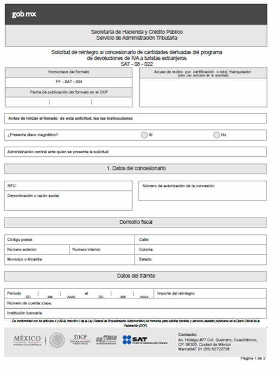 Solicitud de reintegro al concesionario de cantidades derivadas del programa de devoluciones de IVA a turistas extranjeros. 21.6 x 27.9 cms./Carta. Impresión negra en fondo blanco. Esta forma es de libre impresión.