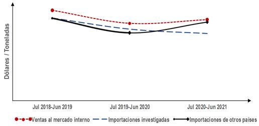 c. El precio promedio de las importaciones investigadas se situó por debajo del precio promedio de las ventas al mercado interno de la rama de producción nacional a lo largo del periodo analizado en porcentajes que oscilaron entre 8% y 17%, los cuales, además, disminuyeron en el periodo analizado. Lo anterior, considerando que el bajo nivel de precios de las importaciones investigadas observado en el periodo analizado está asociado con volúmenes crecientes de las mismas, una mayor participación en el mercado nacional y el posible desplazamiento de ventas de mercancía fabricada por Minera Autlán. Aunado a lo anterior, se observaron indicios de que, en caso de mantenerse la presencia de dichas importaciones, sus bajos precios obligarían a la rama de producción nacional de ferromanganeso a disminuir los suyos, a fin de no verse desplazados en el mercado, incrementando la afectación observada en el periodo analizado tanto en sus indicadores económicos como en los financieros.