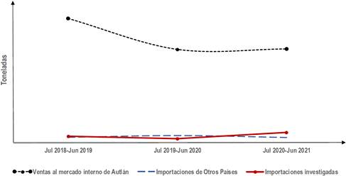 a. en relación con las importaciones de orígenes distintos al investigado, se confirmó que éstas disminuyeron su participación en el periodo analizado en 13 puntos porcentuales respecto a las importaciones totales (al pasar de representar 46% en el periodo julio de 2018-junio de 2019 a 33% en el periodo investigado), ya que cayeron 25% en el periodo investigado y 2% en el periodo analizado; además de que, tal como lo señaló Minera Autlán, en el periodo investigado, se realizaron a precios superiores (14%) a los de la mercancía investigada, lo que confirma que dichas importaciones no pudieron considerarse como causal de daño a la rama de producción nacional;